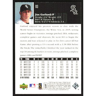 This is a 2006 Upper Deck Jon Garland baseball card. The card is #113 and pictures show condition.