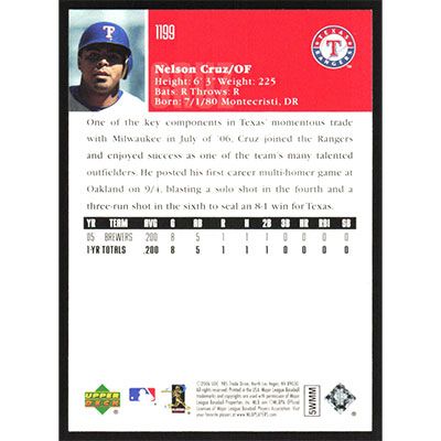 This is a 2006 Upper Deck Nelson Cruz baseball card. The card is #1199 and pictures show condition.