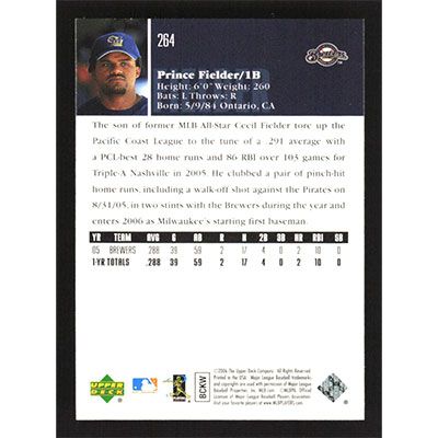 This is a 2006 Upper Deck Prince Fielder baseball card. The card is #264 and pictures show condition.