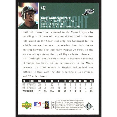 This is a 2006 Upper Deck Joey Gathright baseball card. The card is #442 and pictures show condition.