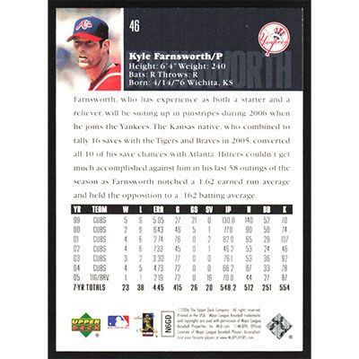 This is a 2006 Upper Deck Kyle Farnsworth baseball card. The card is #46 and pictures show condition.