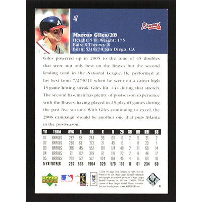 This is a 2006 Upper Deck Marcus Giles baseball card. The card is #47 and pictures show condition.