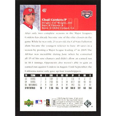 This is a 2006 Upper Deck Chad Cordero baseball card. The card is #487 and pictures show condition.