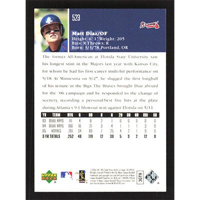 This is a 2006 Upper Deck Matt Diaz baseball card. The card is #523 and pictures show condition.