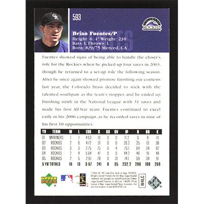 This is a 2006 Upper Deck Brian Fuentes baseball card. The card is #593 and pictures show condition.