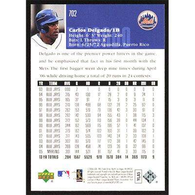This is a 2006 Upper Deck Carlos Delgado baseball card. The card is #702 and pictures show condition.