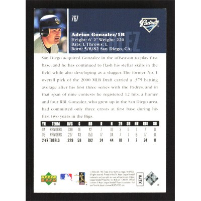 This is a 2006 Upper Deck Adrian Gonzalez baseball card. The card is #767 and pictures show condition.