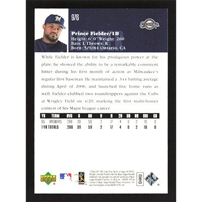 This is a 2006 Upper Deck Prince Fielder baseball card. The card is #976 and pictures show condition.