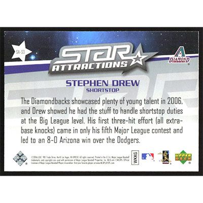 This is a 2006 Upper Deck Star Attractions Stephen Drew baseball card. The card is #SA-SD and pictures show condition. Team(s): Arizona Diamondbacks Rookie Card (RC)