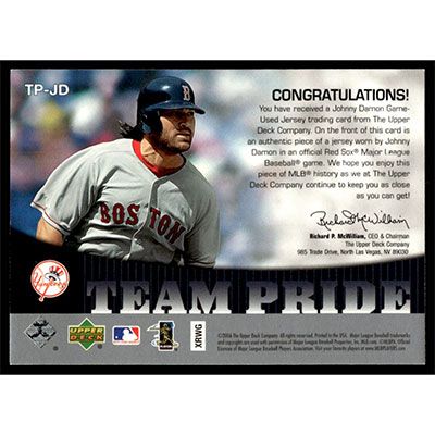 This is a 2006 Upper Deck Team Pride Materials Johnny Damon Jersey baseball card. The card is #TP-JD and pictures show condition. Team(s): New York Yankees