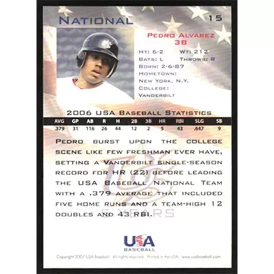 This is a 2006 USA Baseball Pedro Alvarez baseball card. The card is #15 and pictures show condition.