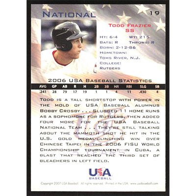 This is a 2006 USA Baseball Todd Frazier baseball card. The card is #19 and pictures show condition.