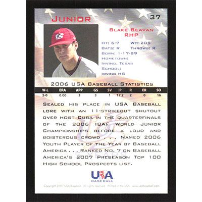 This is a 2006 USA Baseball Blake Beavan autographed baseball card. This card has been signed, in blue, by Blake Beavan, and is guaranteed authentic by Ballcardz.com. The card is #37 and pictures show condition.