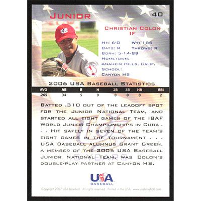 This is a 2006 USA Baseball Christian Colon autographed baseball card. This card has been signed, in blue, by Christian Colon, and is guaranteed authentic by Ballcardz.com. The card is #40 and pictures show condition.