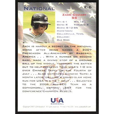 This is a 2006 USA Baseball Foil Zack Cozart autographed baseball card. This card has been signed, in blue, by Zack Cozart, and is guaranteed authentic by Ballcardz.com. The card is #F-6 and pictures show condition.