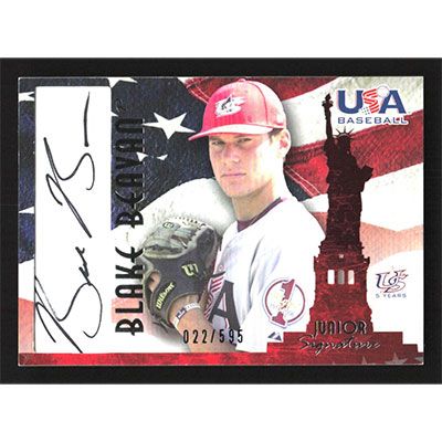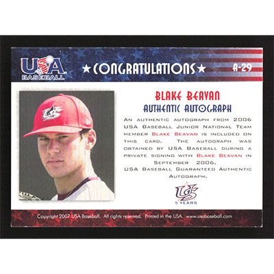 This is a 2006 USA Baseball Signatures Black Blake Beavan autographed baseball card. This card has been signed, in black, by Blake Beavan, and is certified authentic by USA Baseball. The card is #A-29 and pictures show condition. This card is limited; #'d 022/595.