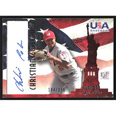 This is a 2006 USA Baseball Signatures Blue Christian Colon autographed baseball card. This card has been signed, in blue, by Christian Colon, and is certified authentic by USA Baseball. The card is #A-32 and pictures show condition. This card is limited; #'d 104/275.