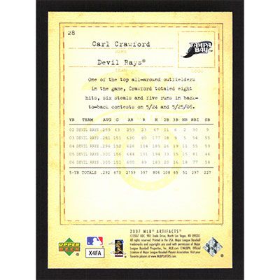 This is a 2007 Artifacts Carl Crawford baseball card. The card is #28 and pictures show condition.
