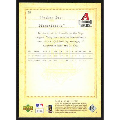 This is a 2007 Artifacts Stephen Drew baseball card. The card is #35 and pictures show condition.