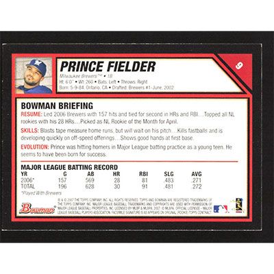 This is a 2007 Bowman Prince Fielder baseball card. The card is #9 and pictures show condition.