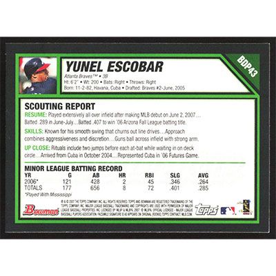 This is a 2007 Bowman Draft Yunel Escobar baseball card. The card is #BDP43 and pictures show condition.