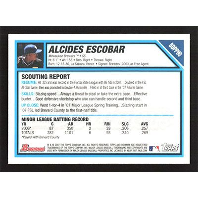 This is a 2007 Bowman Draft Future's Game Prospects Gold Alcides Escobar baseball card. The card is #BDPP90 and pictures show condition. Team(s): Milwaukee Brewers