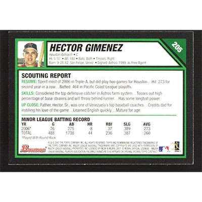 This is a 2007 Bowman Gold Hector Gimenez baseball card. The card is #205 and pictures show condition.