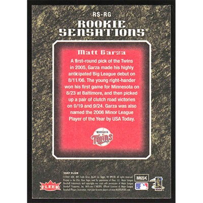 This is a 2007 Fleer Rookie Sensations Matt Garza baseball card. The card is #RS-RG and pictures show condition. Team(s): Minnesota Twins Rookie Card (RC)