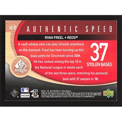 This is a 2007 SP Authentic Authentic Speed Ryan Freel baseball card. The card is #AS-43 and pictures show condition.
