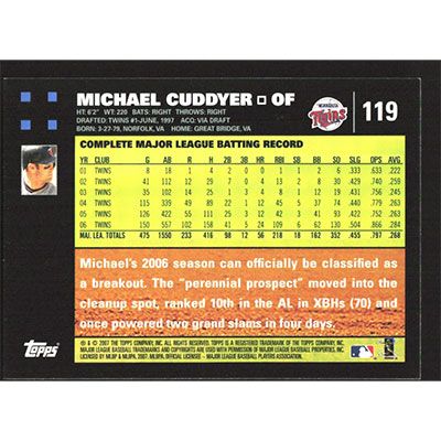 This is a 2007 Topps Michael Cuddyer baseball card. The card is #119 and pictures show condition.