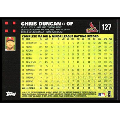 This is a 2007 Topps Chris Duncan baseball card. The card is #127 and pictures show condition.
