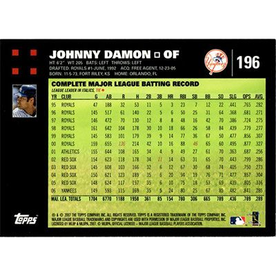 This is a 2007 Topps Johnny Damon baseball card. The card is #196 and pictures show condition.