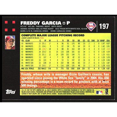 This is a 2007 Topps Freddy Garcia baseball card. The card is #197 and pictures show condition.