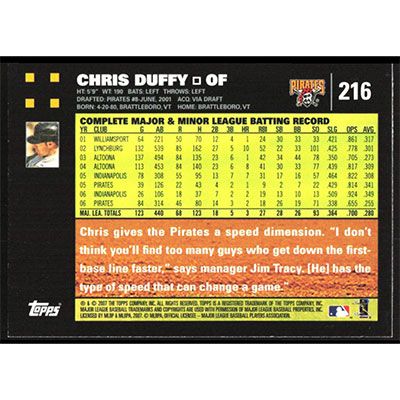 This is a 2007 Topps Chris Duffy baseball card. The card is #216 and pictures show condition.