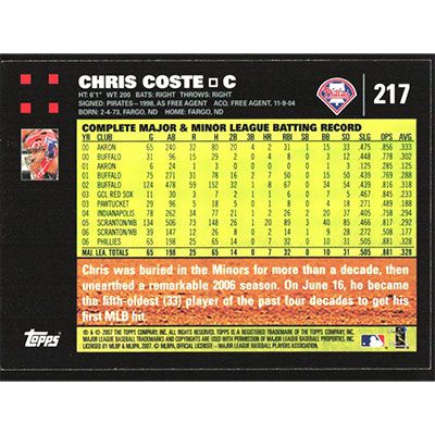 This is a 2007 Topps Chris Coste baseball card. The card is #217 and pictures show condition.