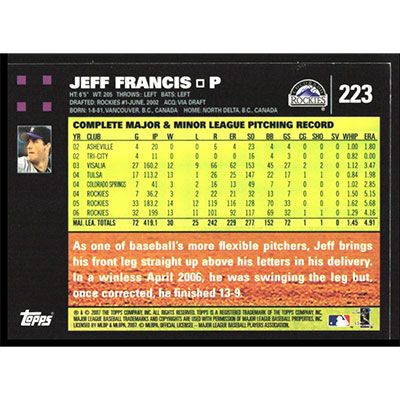 This is a 2007 Topps Jeff Francis baseball card. The card is #223 and pictures show condition.