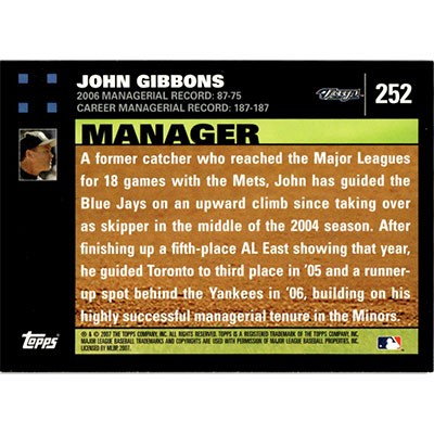 This is a 2007 Topps John Gibbons baseball card. The card is #252 and pictures show condition.