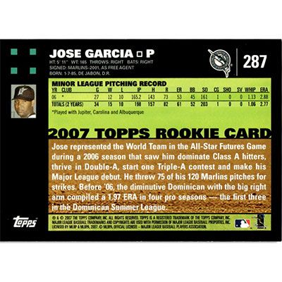 This is a 2007 Topps Jose Garcia baseball card. The card is #287 and pictures show condition.