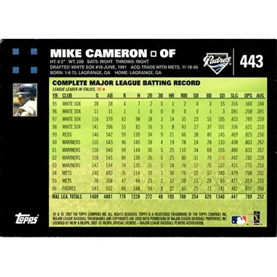 This is a 2007 Topps Mike Cameron autographed baseball card. This card has been signed, in black, by Mike Cameron, and is guaranteed authentic by Ballcardz.com. The card is #443 and is in NM-MT condition.