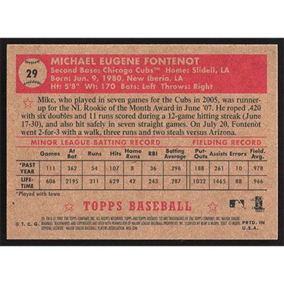 This is a 2007 Topps '52 Mike Fontenot autographed baseball card. This card has been signed, in blue, by Mike Fontenot, and is guaranteed authentic by Ballcardz.com. The card is #29 and pictures show condition.