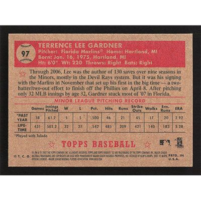 This is a 2007 Topps '52 Lee Gardner baseball card. The card is #97 and pictures show condition.