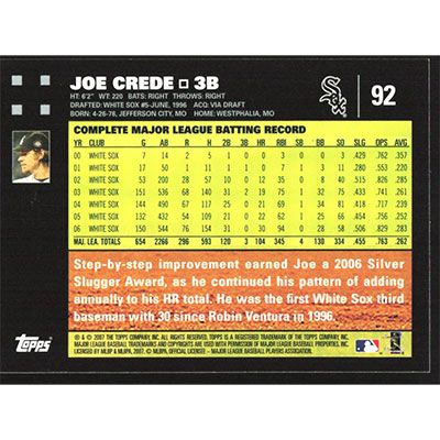 This is a 2007 Topps Joe Crede baseball card. The card is #92 and pictures show condition.
