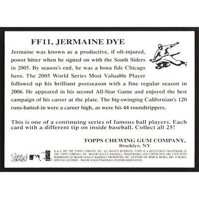 This is a 2007 Topps Flashback Fridays Jermaine Dye baseball card. The card is #FF11 and pictures show condition.