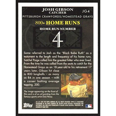 This is a 2007 Topps Gibson Home Run History Josh Gibson baseball card. The card is #JG4 and pictures show condition. Team(s): Pittsburgh Crawfords/Homestead Grays