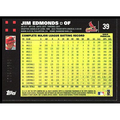 This is a 2007 Topps Gold Jim Edmonds baseball card. The card is #39 and pictures show condition. This card is limited; #'d 0995/2007. Team(s): St. Louis Cardinals