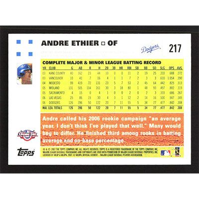 This is a 2007 Topps Opening Day Andre Ethier baseball card. The card is #217 and pictures show condition.
