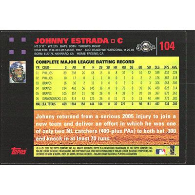 This is a 2007 Topps Red Backs Johnny Estrada baseball card. The card is #104 and pictures show condition.