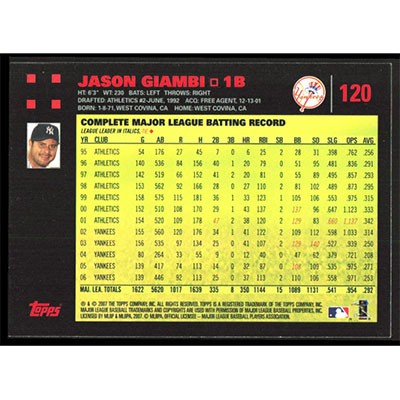 This is a 2007 Topps Red Backs Jason Giambi baseball card. The card is #120 and pictures show condition.
