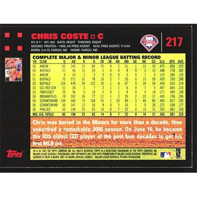 This is a 2007 Topps Red Backs Chris Coste baseball card. The card is #217 and pictures show condition.