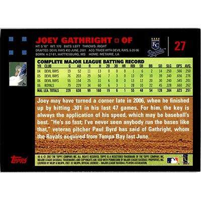 This is a 2007 Topps Red Backs Joey Gathright baseball card. The card is #27 and pictures show condition.